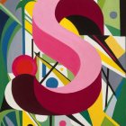 The image features an abstract composition with bold colors and geometric shapes, prominently showcasing a stylized letter "S" surrounded by vibrant patterns and dynamic lines.
