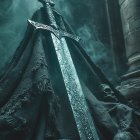 A majestic sword rests atop dark, tattered fabric, surrounded by eerie fog and skulls, evoking a sense of mystery and ancient power in a shadowy, atmospheric setting.