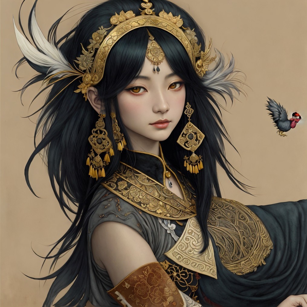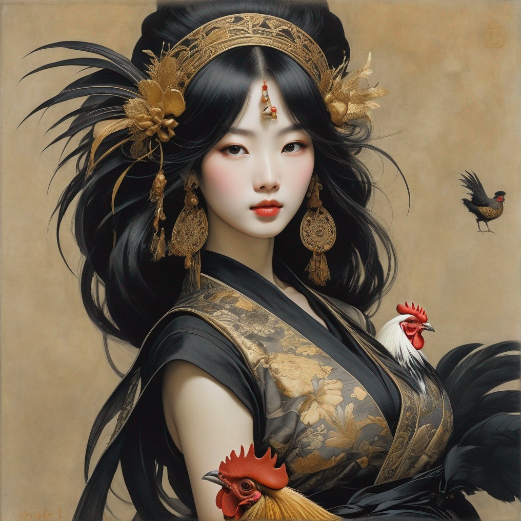 Digital Portrait of Woman in Traditional Attire with Rooster