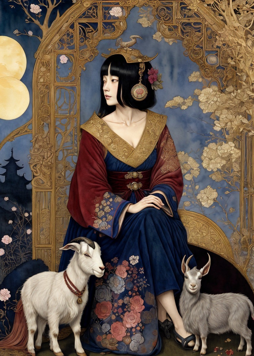 The girl and the goat. Medieval Japanese Artists Sumi-e Style, indigo, Ruby red, Velvet Black, Shabby, Dull Gold, Amber Gray, Golden Ratio, Surreal Fantasy, Elegant, High Definition Ultra Fine 3D Line, Zenangle Style, Watercolor Patchwork , Arthur Rackham Style, Paul Kidby, , Jacek yerka, Extremely Detailed, Intricate, Thoughtful, HDR, Fractal, Beautiful, Award Winning, Fantasy Look, Fantasy, Crisp Quality