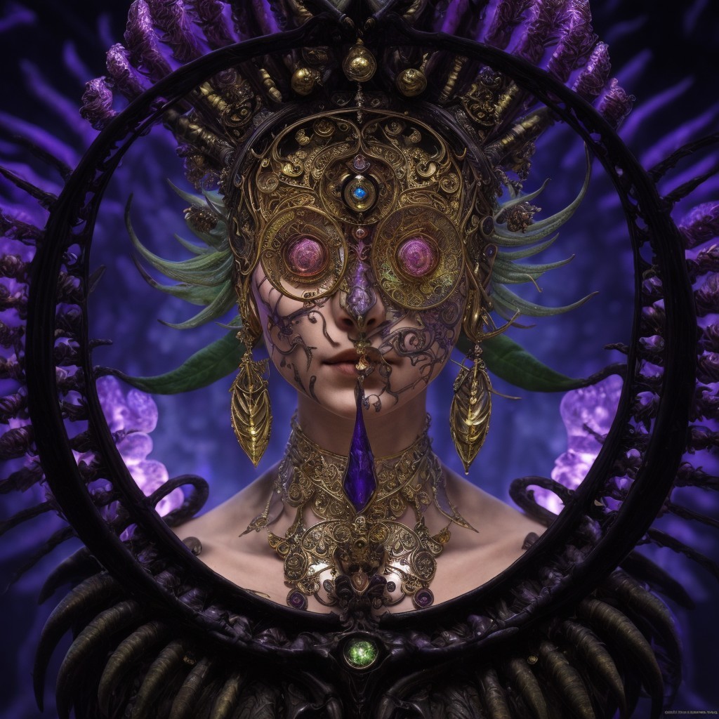 A mysterious figure in an ornate golden mask and headdress surrounded by dark, purple flora, exuding an aura of fantasy and elegance.
