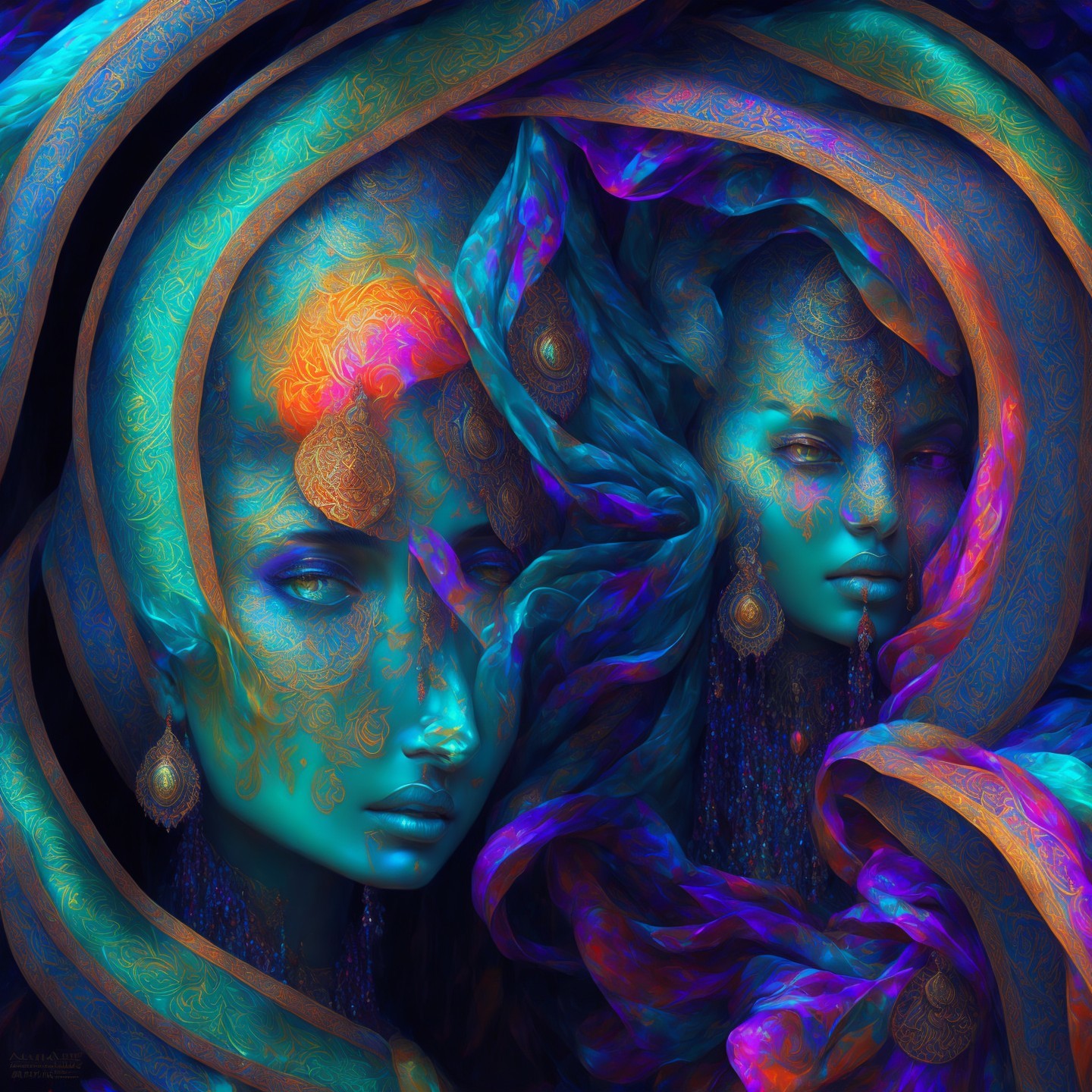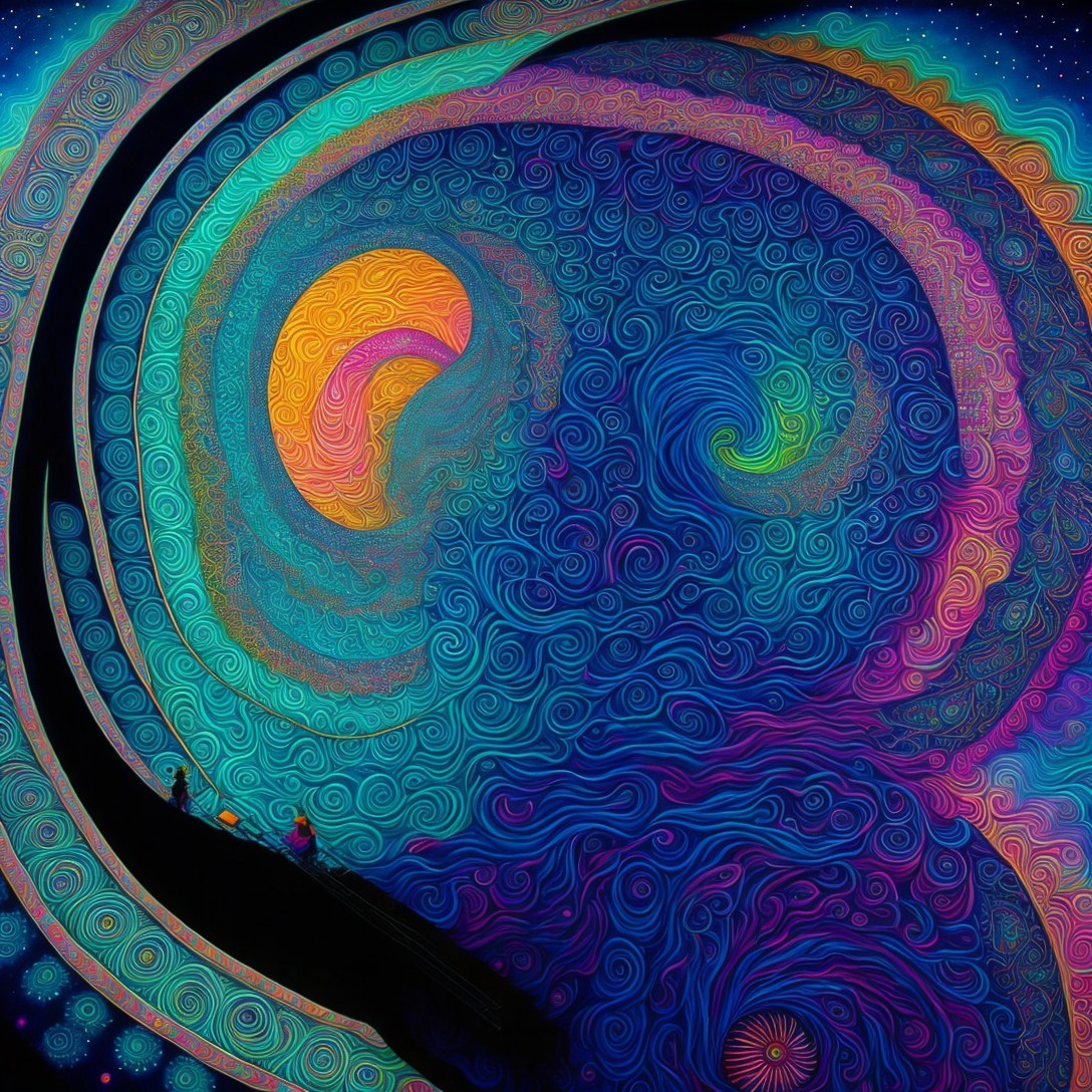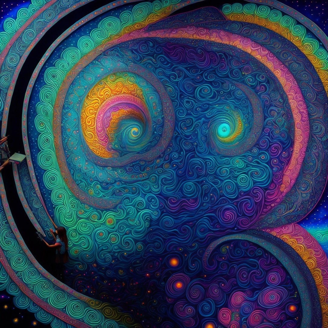 + Prompt:Surreal, dreamlike painting. A girl painter with wild turquoise hair is painting a mural on the wall. She paints a winding bridge as a gateway to a vivid, colourful galaxy full of multicoloured planets and burning comets, in the form of an optical illusion. It draws us in. Zentangle mandalas on the walls. Intricate, detailed, extremely-ultra-detailed line-art, Zentangle art.