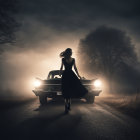 Prompt: Full body digital drawing, horror movie scene of a beautiful woman, has real long flowing wavy white hair, in a very long red satin dress, Gabriella walking home through dark followed by creepy stalkers a guy in a car , terrifying, dark ambiance, misty, intensity, moonlight black and white phone. 3d art