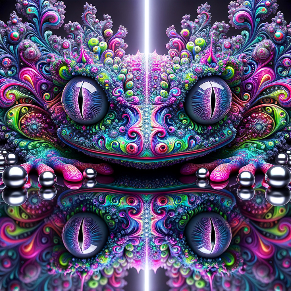 Prompt: Create a highly detailed, symmetrical image with a vibrantly colored, psychedelic fractal gecko-axolotl hybrid reflected in a mirror finish with an intricate, fractal-like skin pattern