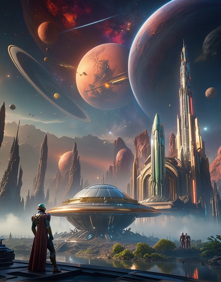 A futuristic landscape features towering structures and spacecraft against a backdrop of vibrant planets, rings, and a starry sky, evoking a sense of exploration and cosmic wonder.
