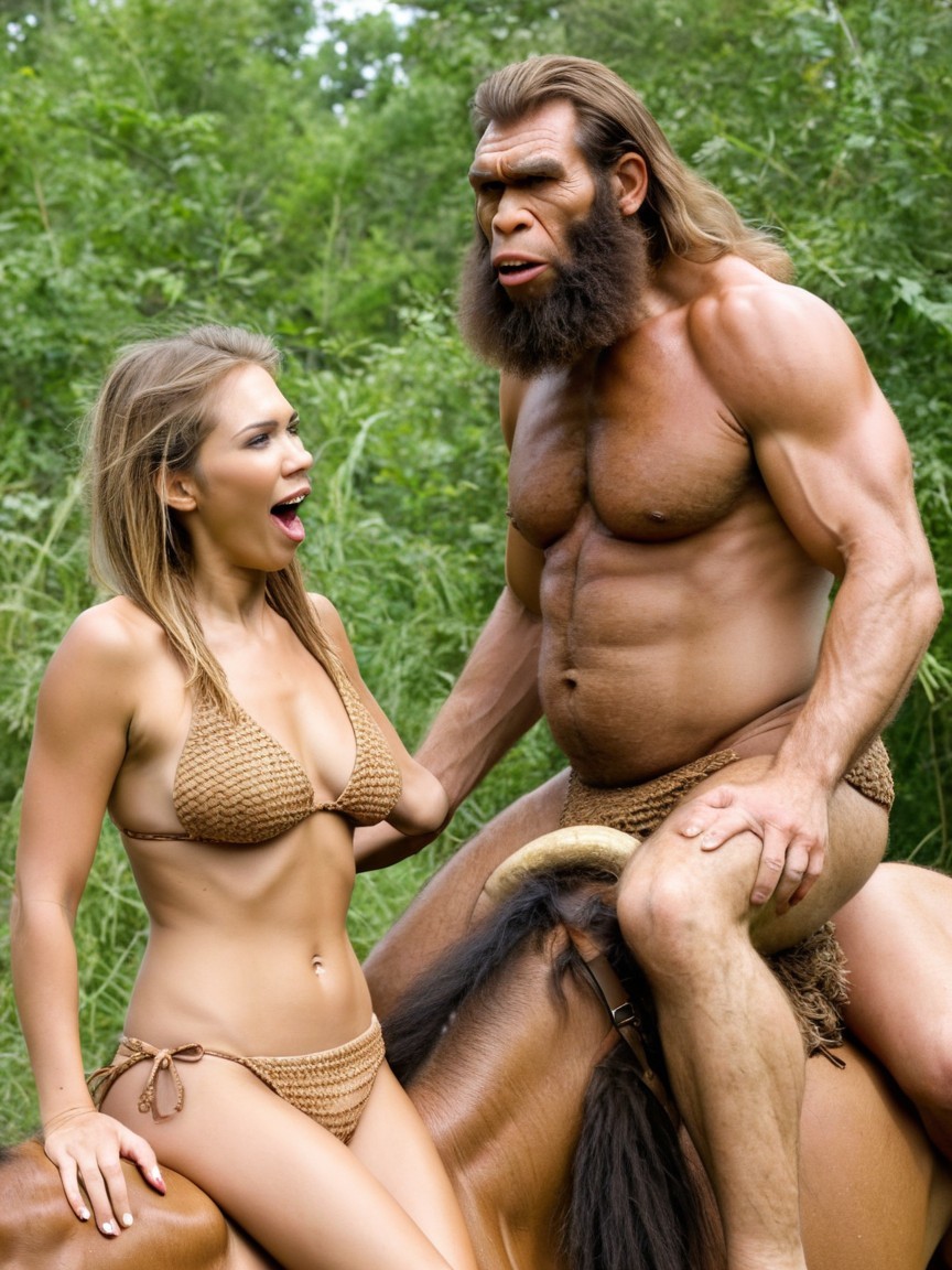 A woman in a knitted bikini with a shocked expression, wearing a brown crocheted bikini, is sitting on the back of a brown horse with a dark mane and tail. Her hand is placed on the horse's back, and her mouth is open in surprise, revealing her teeth. Next to her