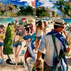 A vibrant beach scene filled with sunbathers and visitors. People in summer attire meander along the shoreline, with colorful umbrellas, greenery, and coastal buildings in the background.