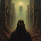 Cloaked Figure in Misty Forest with Ghostly Apparition