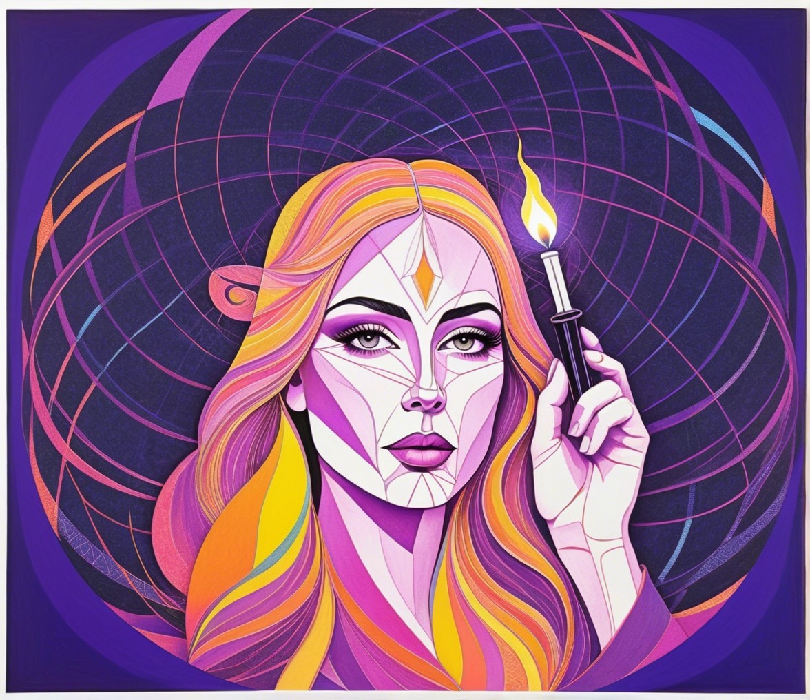 Prompt: Geometric portrait with lineage and line-art fusion, psychedelic Juminocore and abstract scratchbook art blend, stylized lineage illustration featuring a temptress with a burning candle portrayed with a serene expression , stylized sgraffito in zentangle lines reminiscent of Francis Bacon and Georgia O'Keeffe and Jim Davis, lines by William Bradley, lineage art, colorful stylized art, high contrast, style mix of American Gothic and Emshwiller. Stylized cel-shaded sgraffitto, stencil reminiscence, very defined lissajous lines, beautiful line-art, intricate patterns with lineage designs. Stan Lee's and Frank Miller's visual flair, portrait features intricate coloring, very smooth complexion, highly detailed, stylized details in geometrical background, brightness 1.3, divisionism, cymatics, angled, micropen lines in merged styles of Devin Allen, Jacques de Loustal, Gabriel Pacheco, hues by Overton Loyd, intricate detail, stylized, stippled, tesselated, very warm tones, contoured coloring embellishments by Grant Wood, precise Gelsculpt 64K rendering, novelty architecture, dof, bokeh, debeh, Riemann's geometrical spheres, plasticity 1.3, stylized linocut by Earl Moran and Jay Coby, parallax occlusion 1.3, sawtooth wave, lineage in hues, impossible light transitions, liminal, 3D effects, sharp focus, detailed linework, mystical female with grungy allure, outlines by Emshwiller, tints by Arshile Gorky, digital illustration, pastel, expired film, overexposed outlines, artwork is a woodblock print characterized by abstract coherence and only curves in zentangle style, fractalisation, iridescent stylization, rule of thirds, radiance, plasticity 1.5, tesselated. Triadic color scheme light-blue warm yellow light-pink, zentangle, blotting, overspray of paint,quilling, lineage and lighting by Frankenthaler, liminal, joyful,