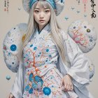A young woman in a traditional white outfit adorned with colorful patterns and accessories, set against a whimsical background of large, decorative spheres. The scene is vibrant and artistic.