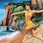 A woman in a green tank top and yellow shorts joyfully leaps near a stunning cliffside beach, with vibrant blue waves crashing below and lush greenery in the background.