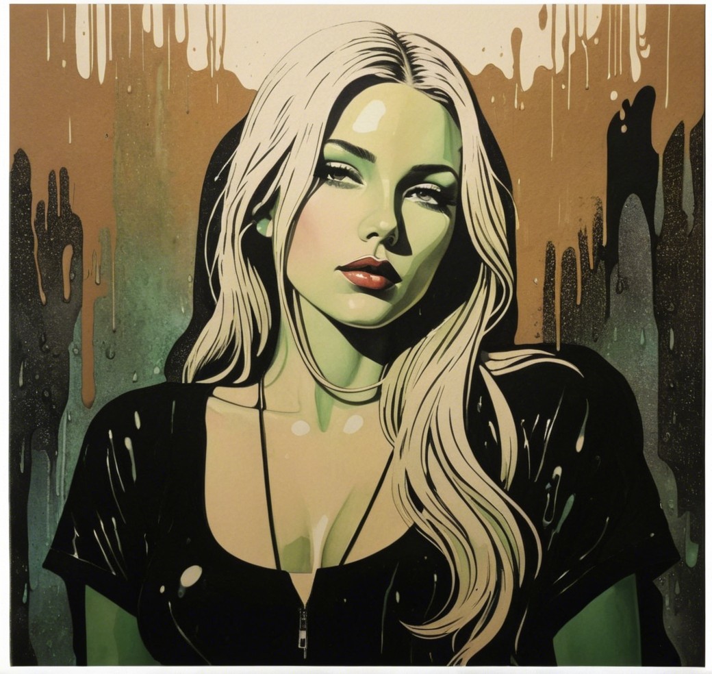+ Prompt:Surreal wet-on-wet painting, dark fantasy theme, unparalleled detail, trensegrety, soft eroticism, line art details, luminism, splash ink technique, intricate paper fibers, paint cracks, plasticity, 1.3, visible textures, symmetrical and precise, black ink with thinned watercolor effects, cartoon references, xeroxed, warm tones, enhanced color vibrancy, adorable psychedelic art, digital painting with iridescence and parallax occlusion, reminiscent of Linocut Portraiture. The subject features an enchantress with tessellated dyed hair, swirls,orbs, blobs, stone wall textures, boho style, fnord, zebadri, cel-shaded, exaggerated features, and a fluffy tousled sculpted hairdo, with melted colors and color glitch effects. The background showcases vibrant hues in a tetradic color scheme of beige, auburn, red, and ochre, mixed media, chalks, layered with detailed plasticity. Utilize dynamic lighting for a softened and otherworldly atmosphere, incorporating a zentangle method for intricate detailing and a sense of tranquility with earth tones, American Gothic 1.7, and dimmed, low-key lighting. Embrace a somber and quaint tone with an Ethereal, Arcane GTNR style, blending watercolor and ink techniques in a patchwork manner. Incorporate VFX-inspired elements like cracks and peeling paint, softened reds, tranquil yellow, and auburn, emotional impact. The composition should have great depth and scale, featuring piercing eyes, a gaze that conveys serenity, and a joyful dreamlike watercolor aesthetic with patterned geometric lines and line-art details. The overall image composition is inspired by saul steinberg.