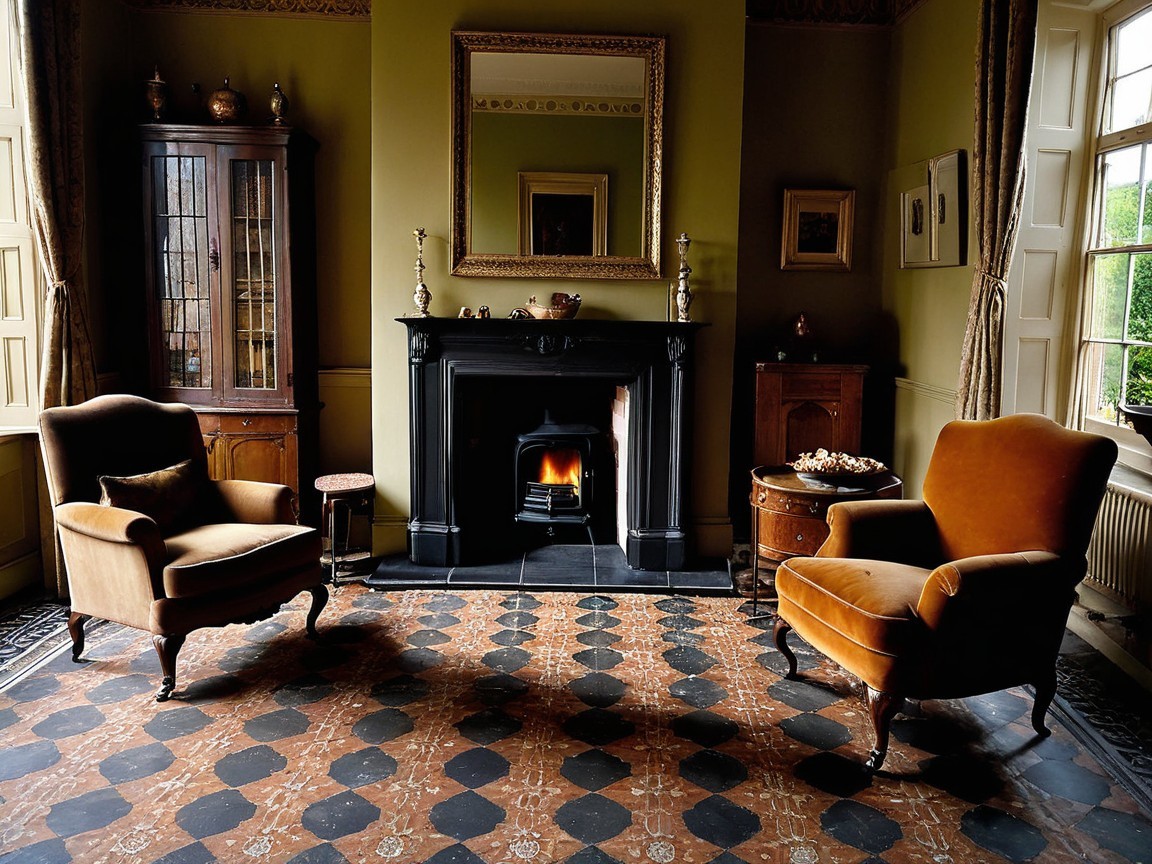 A cozy living room features two elegant armchairs facing a classic fireplace. The room is warmly lit, adorned with a mirror and a wooden cabinet, all set against a patterned floor.