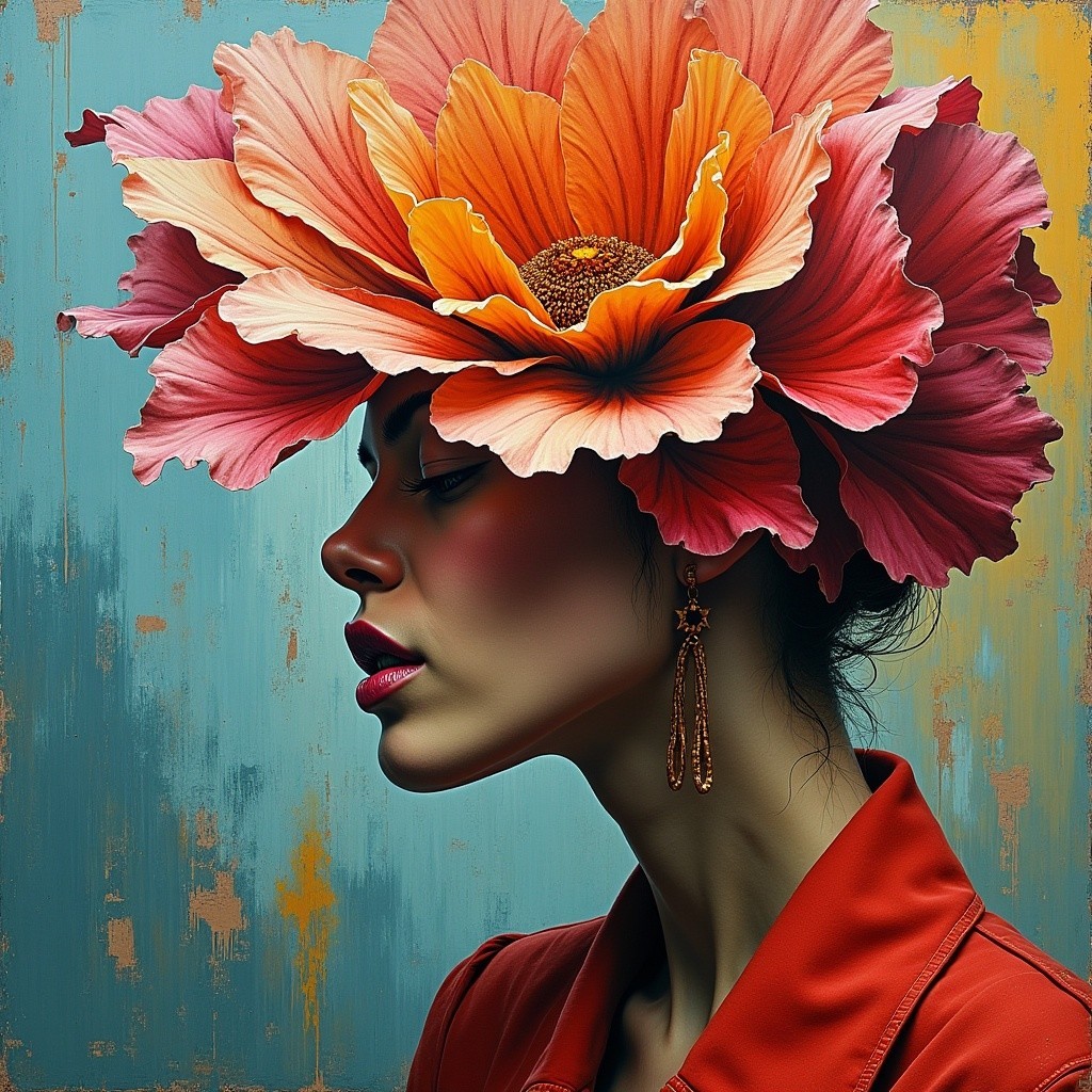 A woman with a large red flower in her hair and a red outfit against a textured blue and grey background.