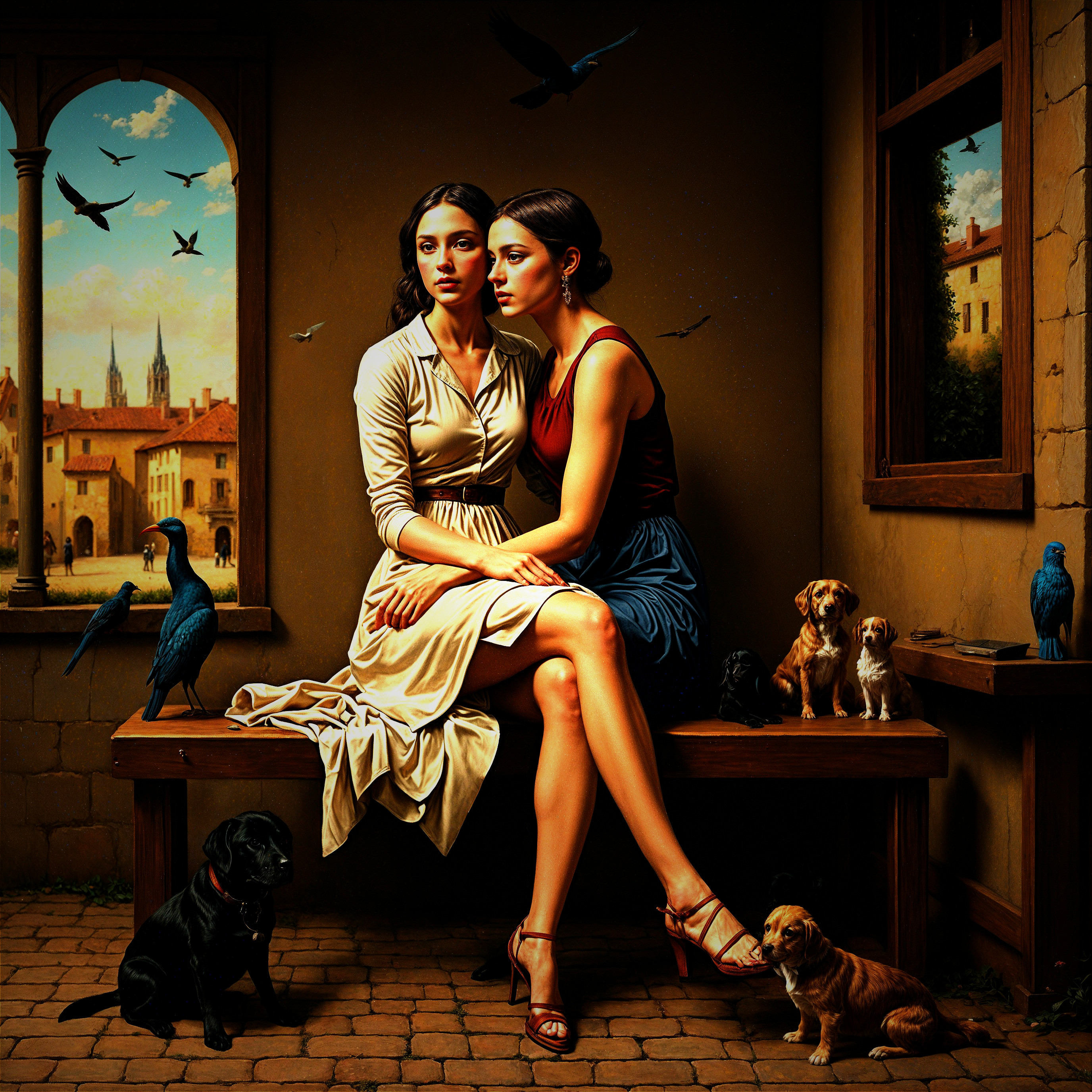 The image features two women sitting together, surrounded by dogs and birds. They are in a room with a picturesque view of a town and a peaceful atmosphere.