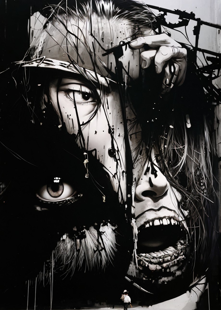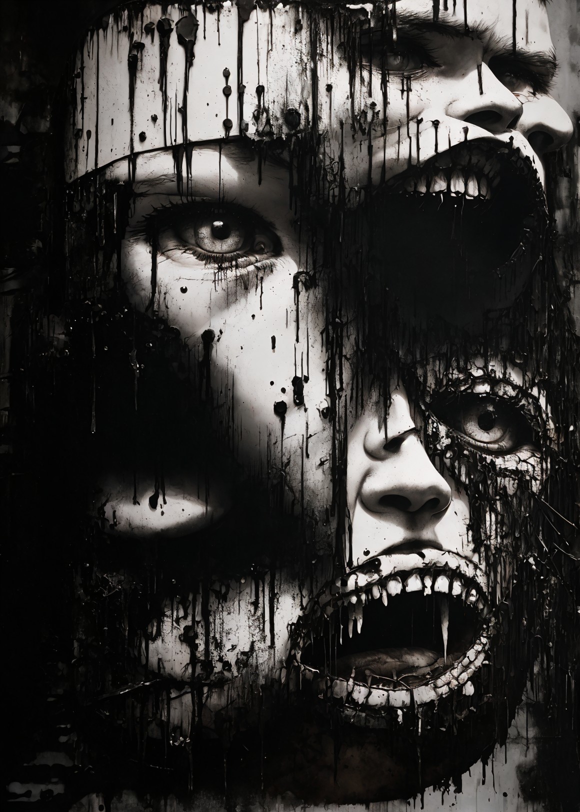 Monochrome graffiti mural featuring layered faces with intense eyes
