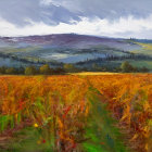 A picturesque vineyard stretches across rolling hills, adorned with autumn-colored grapevines. The sky is partly cloudy, casting soft light over the landscape’s vibrant oranges and greens.