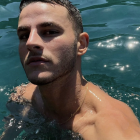 The image features a stylized portrait of a muscular man with short curly hair and a defined jawline. The background is dark, accentuating the figure's strong features and expression.