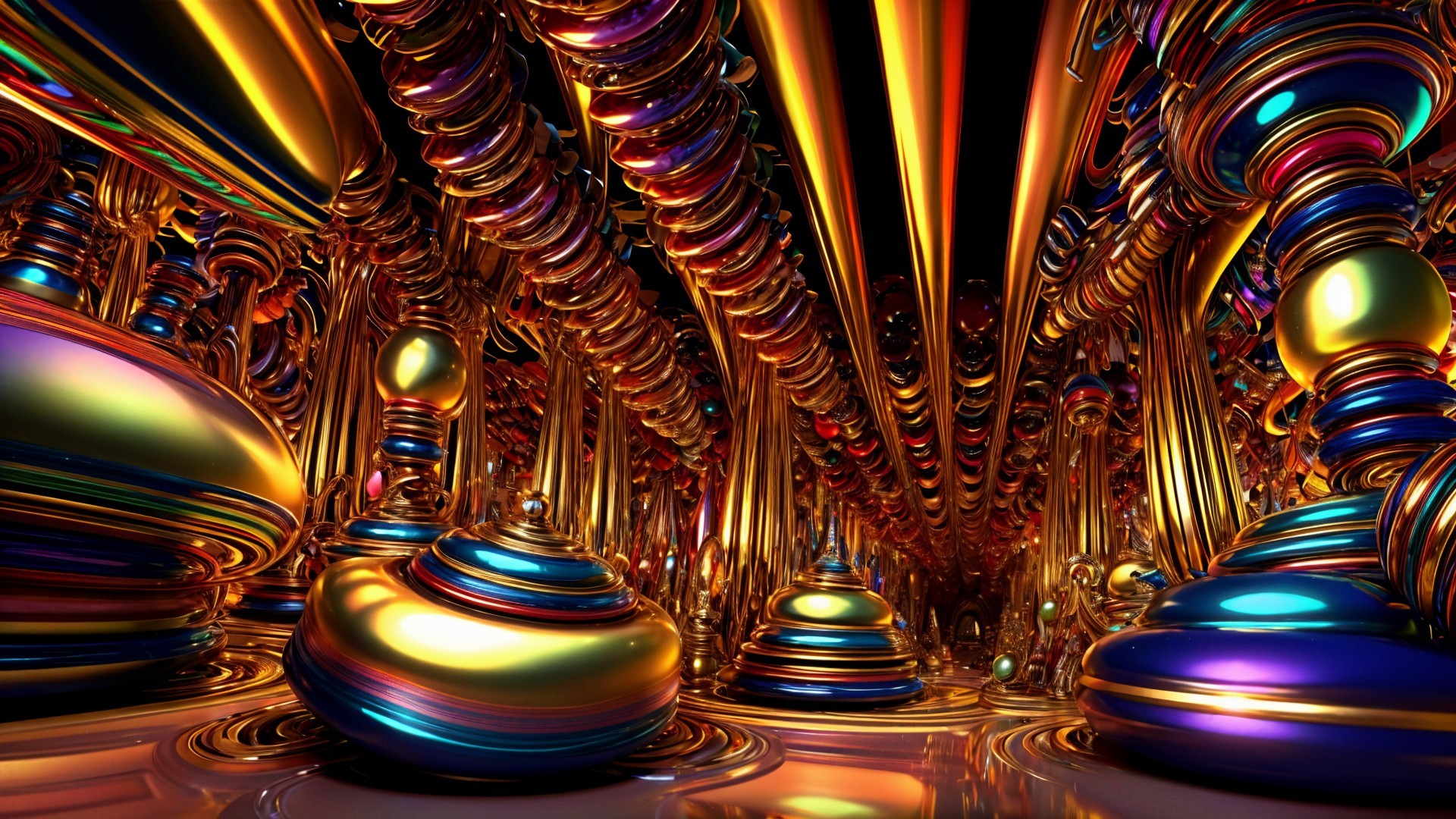 A vibrant, surreal landscape filled with glossy, flowing forms in rich gold, purple, and blue hues. The reflective surfaces create a kaleidoscopic effect, enhancing the ethereal atmosphere.
