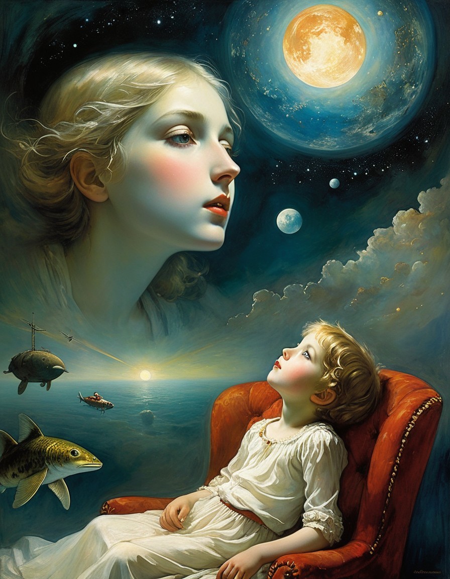 A surreal painting depicts a serene child gazing up at a luminous moon and planets, with a dreamlike woman's face emerging from the sky, alongside fish swimming in the ethereal water below.