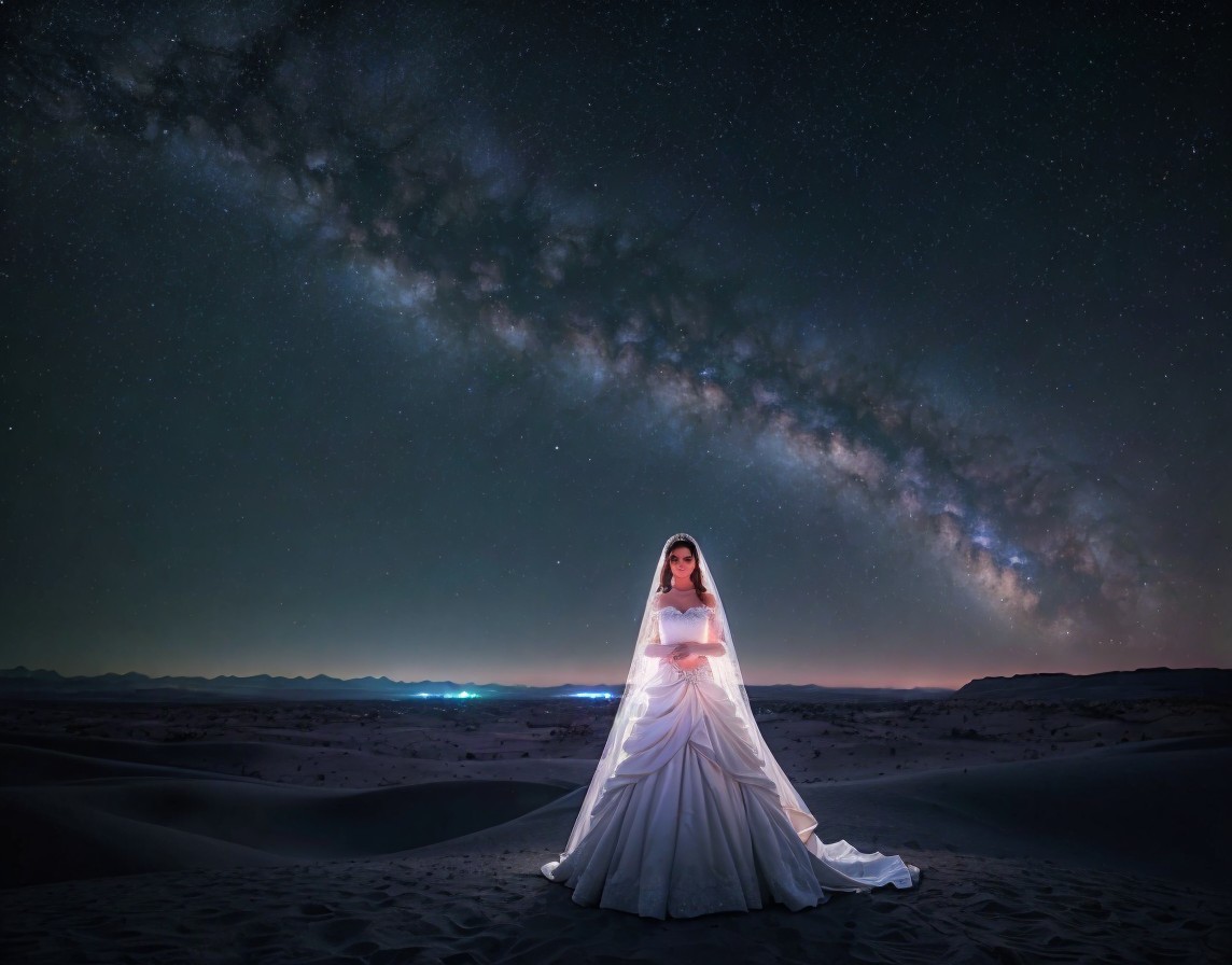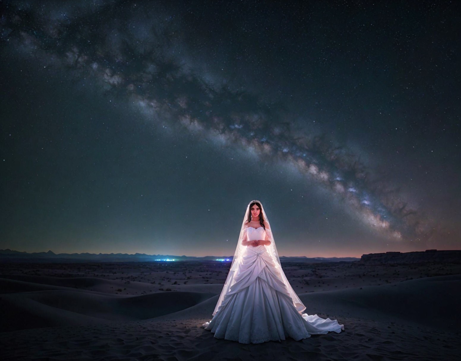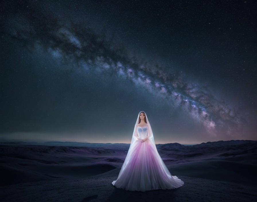 A serene woman in a flowing white gown stands in a vast desert under a starry sky, illuminated softly by celestial light, creating a dreamlike and ethereal atmosphere.