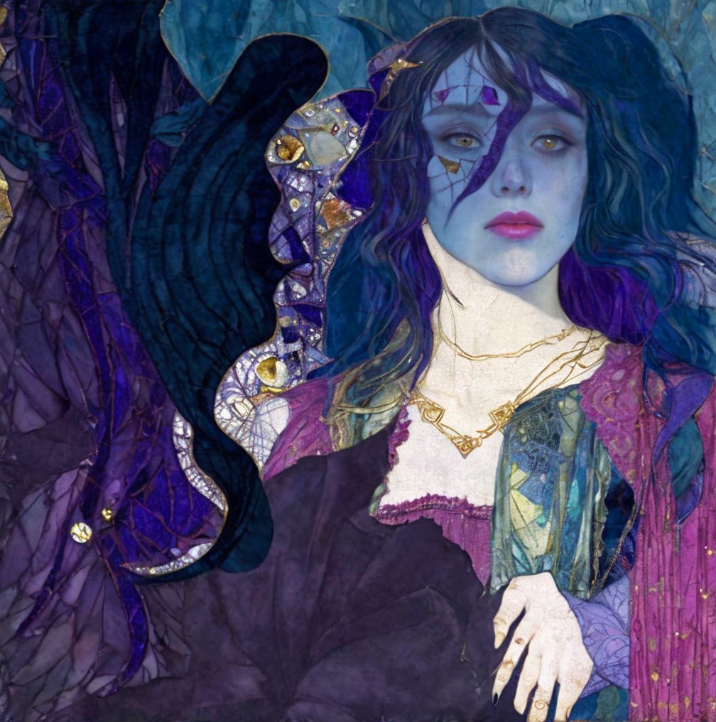 An intricate artwork featuring two intertwined female faces with a blend of dark and light colors. Metallic accents and textured elements enhance the ethereal quality of the composition.