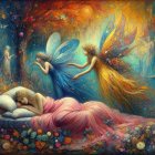 Additional prompt:A painting combining neo-impressionist and futurist styles: The blue flower fairy and the yellow autumn fairy awaken the pink hope fairy from her sleep; mystical style...