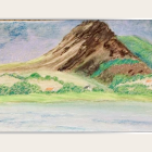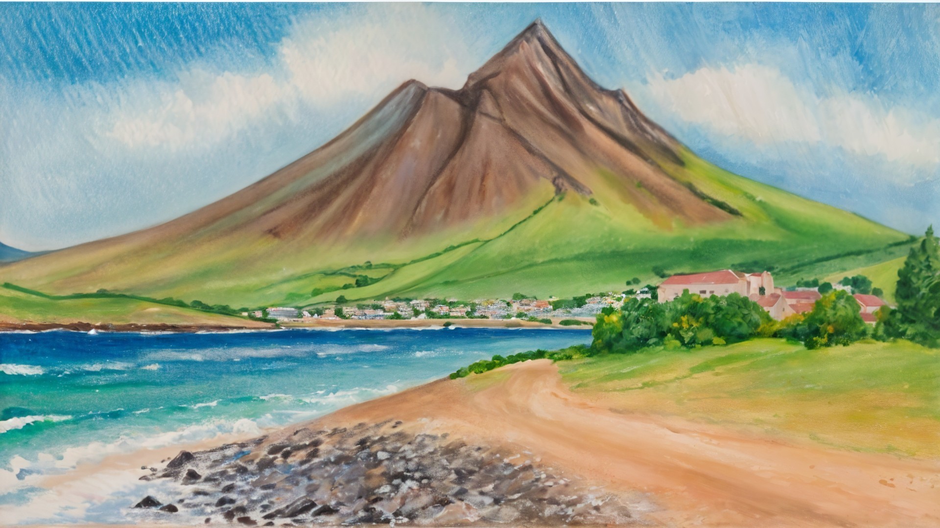 A serene landscape featuring a majestic mountain, lush green hills, and a tranquil lakeside town. The vibrant colors and gentle waves create a peaceful, picturesque scene of nature.