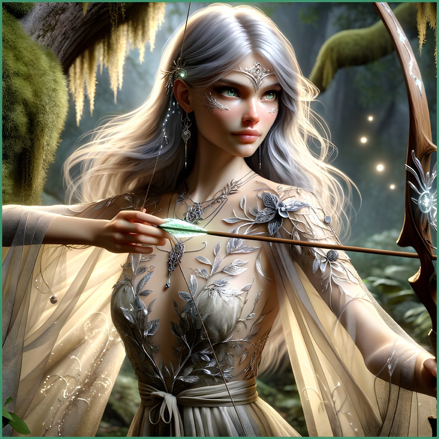 A mystical female archer in a flowing, transparent gown adorned with shimmering patterns stands confidently in an enchanted forest. Her silver hair dances in the wind as she holds a magical bow, surrounded by ancient trees and luminescent plants, creating an ethereal and enchanting scene.