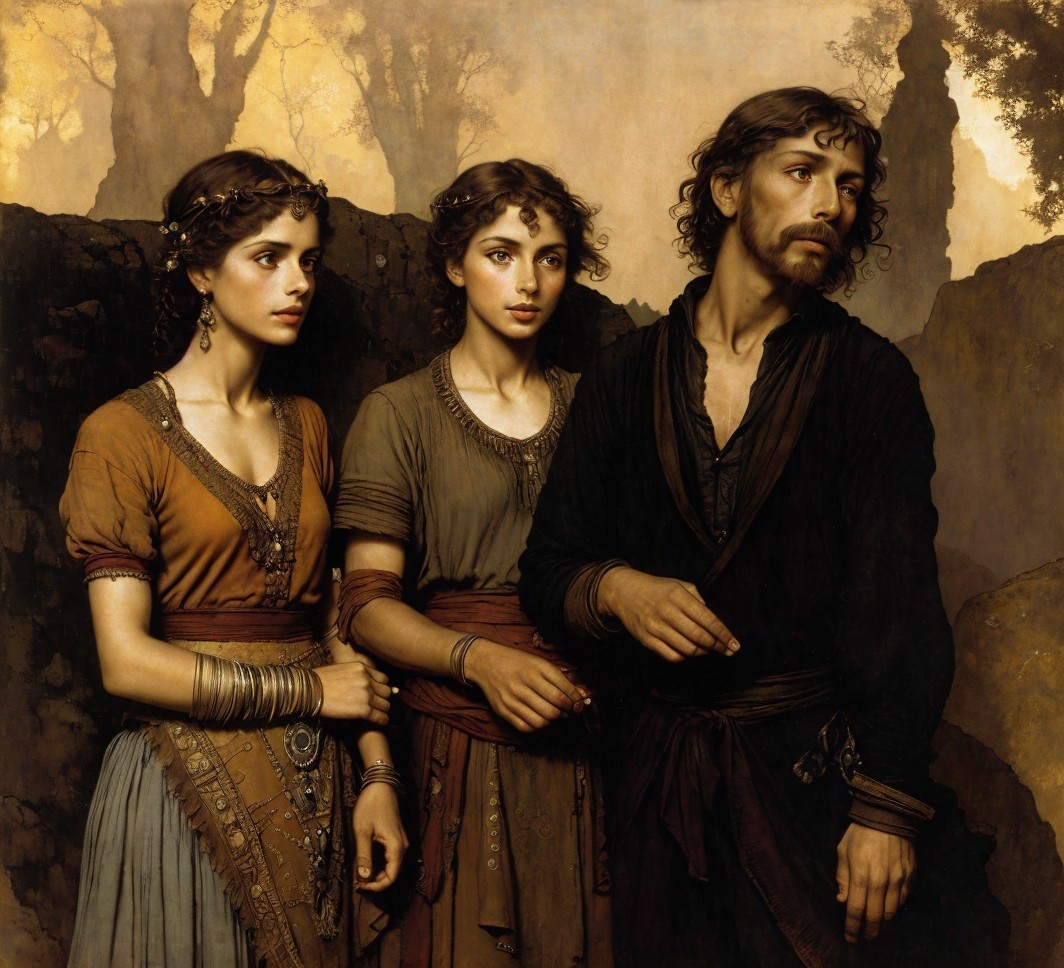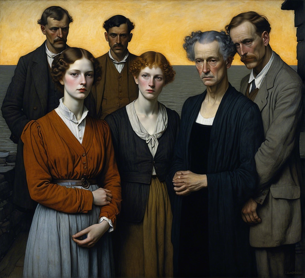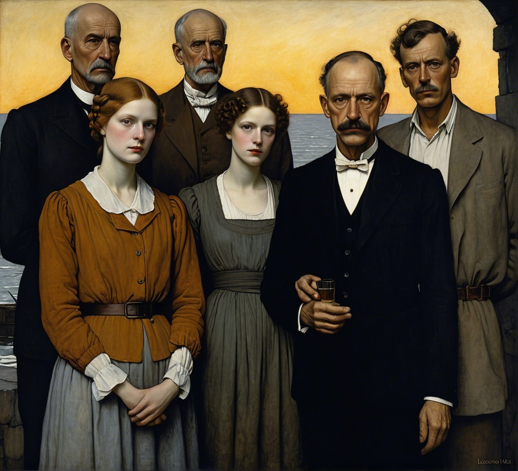 A contemplative young man stands against a dramatic coastal backdrop, with cliffs and a village at sunset. The warm tones of the sky complement his serious expression and relaxed attire.