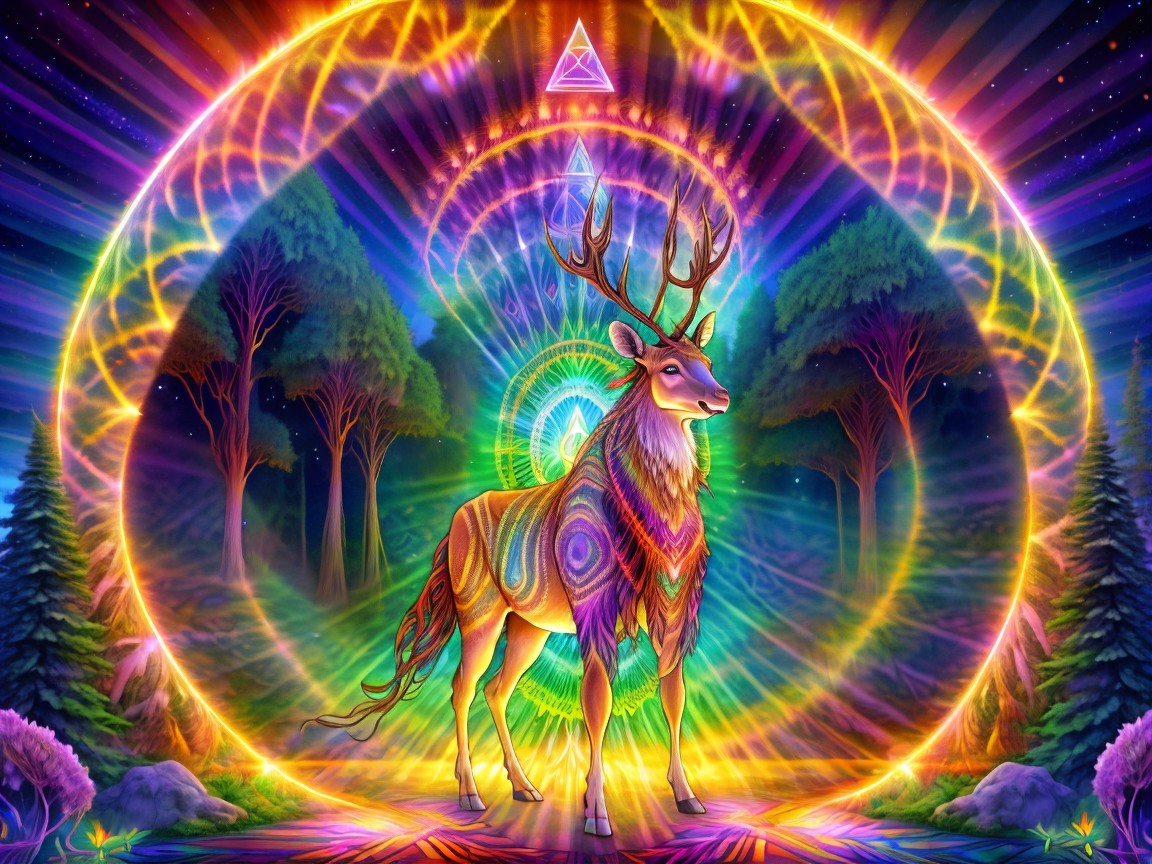 A vibrant, mystical scene featuring towering pyramids, lush tropical foliage, and two majestic deer. Radiant colors and geometric patterns create a dreamlike atmosphere of enchantment.