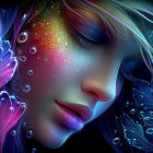 A beautiful, ethereal portrait of a woman with flowing hair, surrounded by vibrant, glowing colors and abstract leaf patterns, creating a mystical and dreamlike atmosphere.