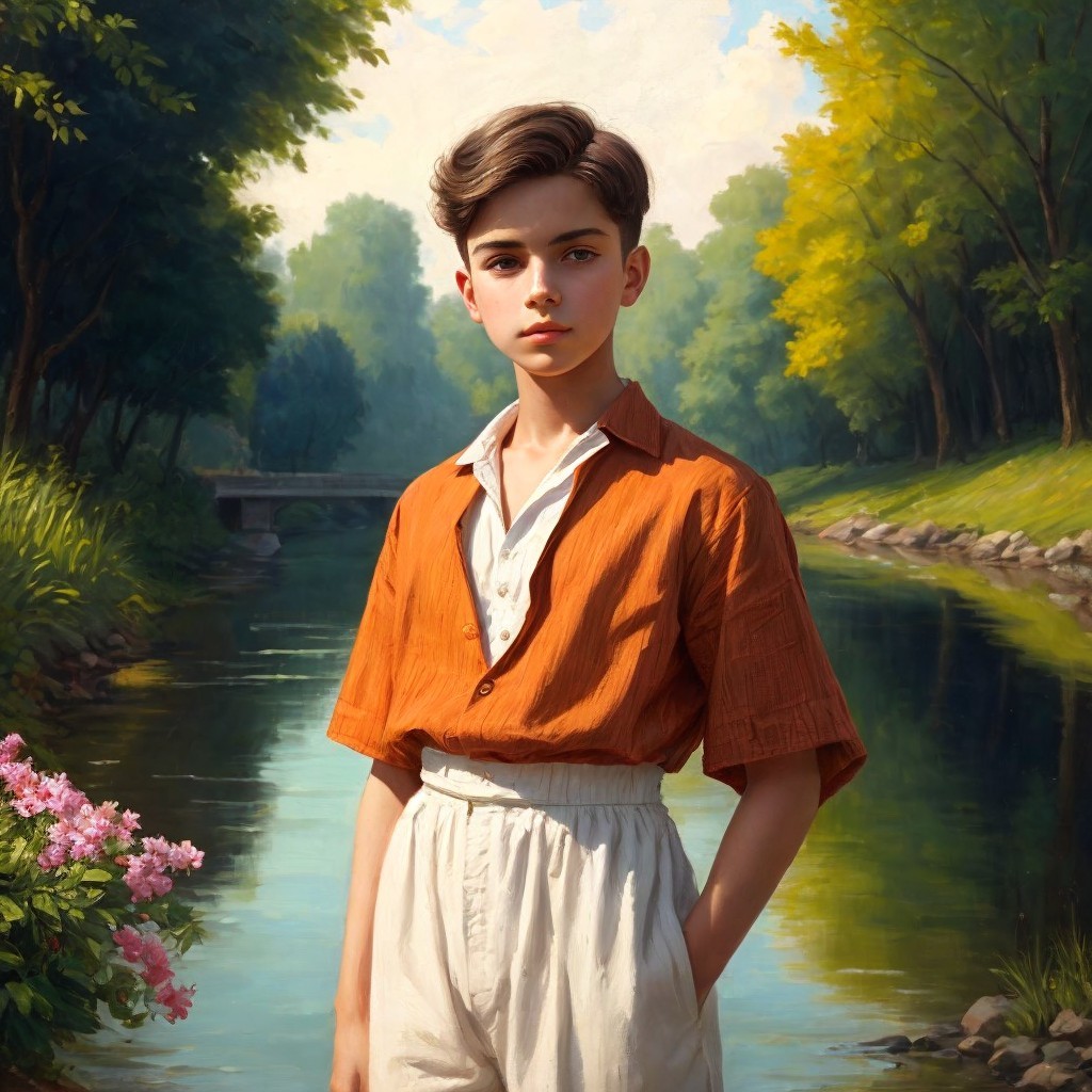 A young boy stands by a serene riverside, wearing a vibrant orange shirt and light pants. He gazes thoughtfully at the viewer, surrounded by lush greenery and blooming flowers in a peaceful setting.