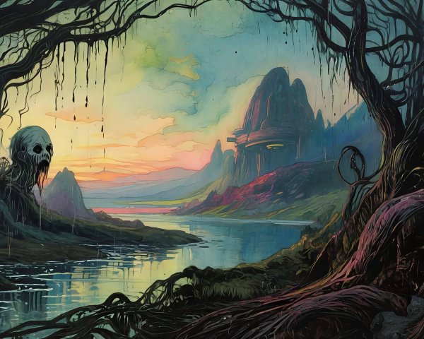 A solitary figure stands on rugged rocks at sunset, illuminated by a fiery star. The vibrant colors of the sky and sea create an otherworldly scene, enhanced by a distant shooting star, evoking a surreal, epic atmosphere.