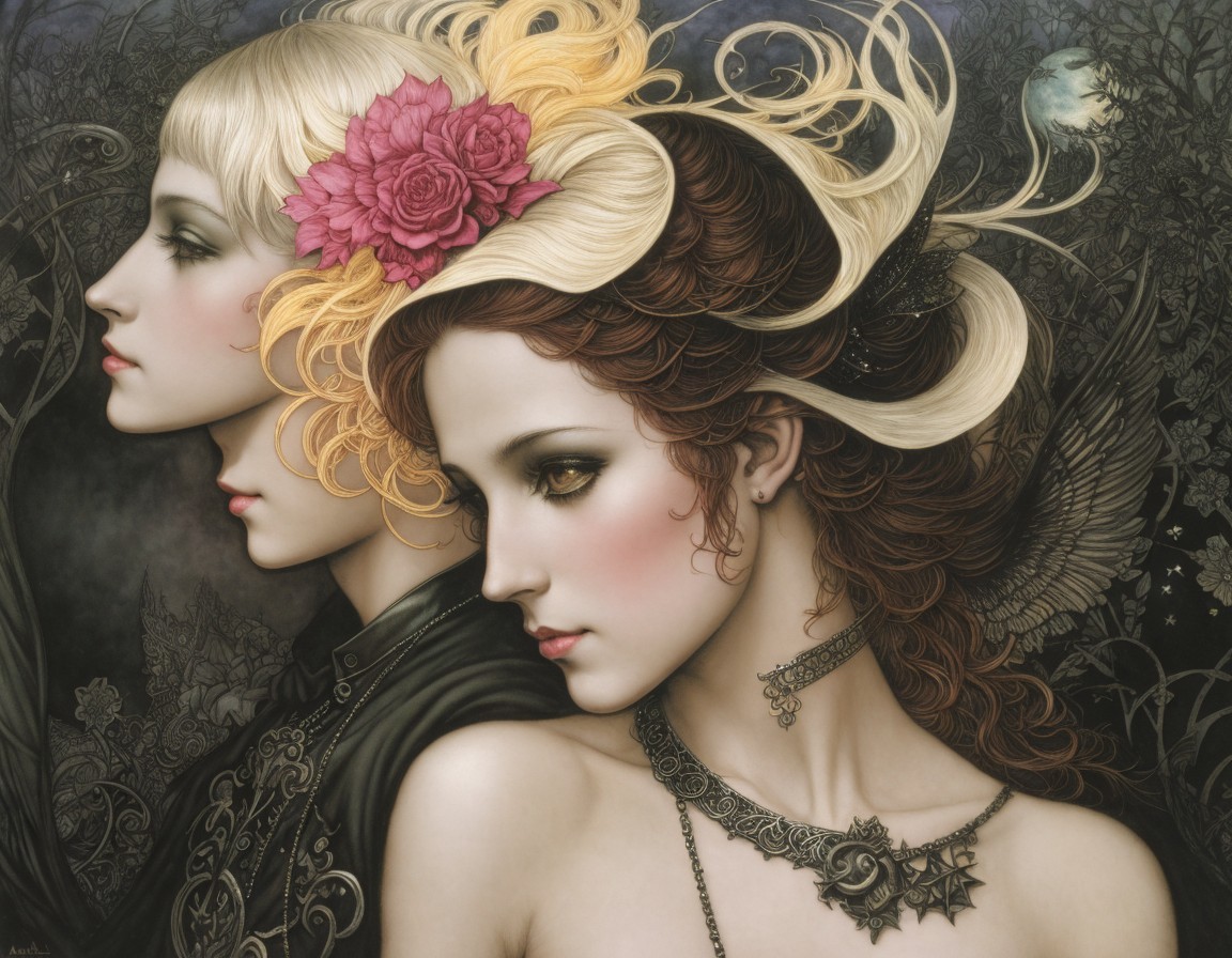 A mystical portrait of a woman with elaborate curly hair adorned with flowers and butterflies, set against a cosmic background with planets and stars, evoking a sense of fantasy and elegance.