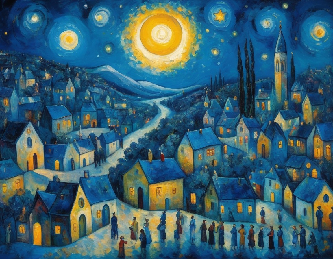 A beautiful Chanukah celebration reminiscent of a magical miraculous painting by Marc Chagall with a bit of Van Gogh added in. Lots of blue. Include a Menorah.