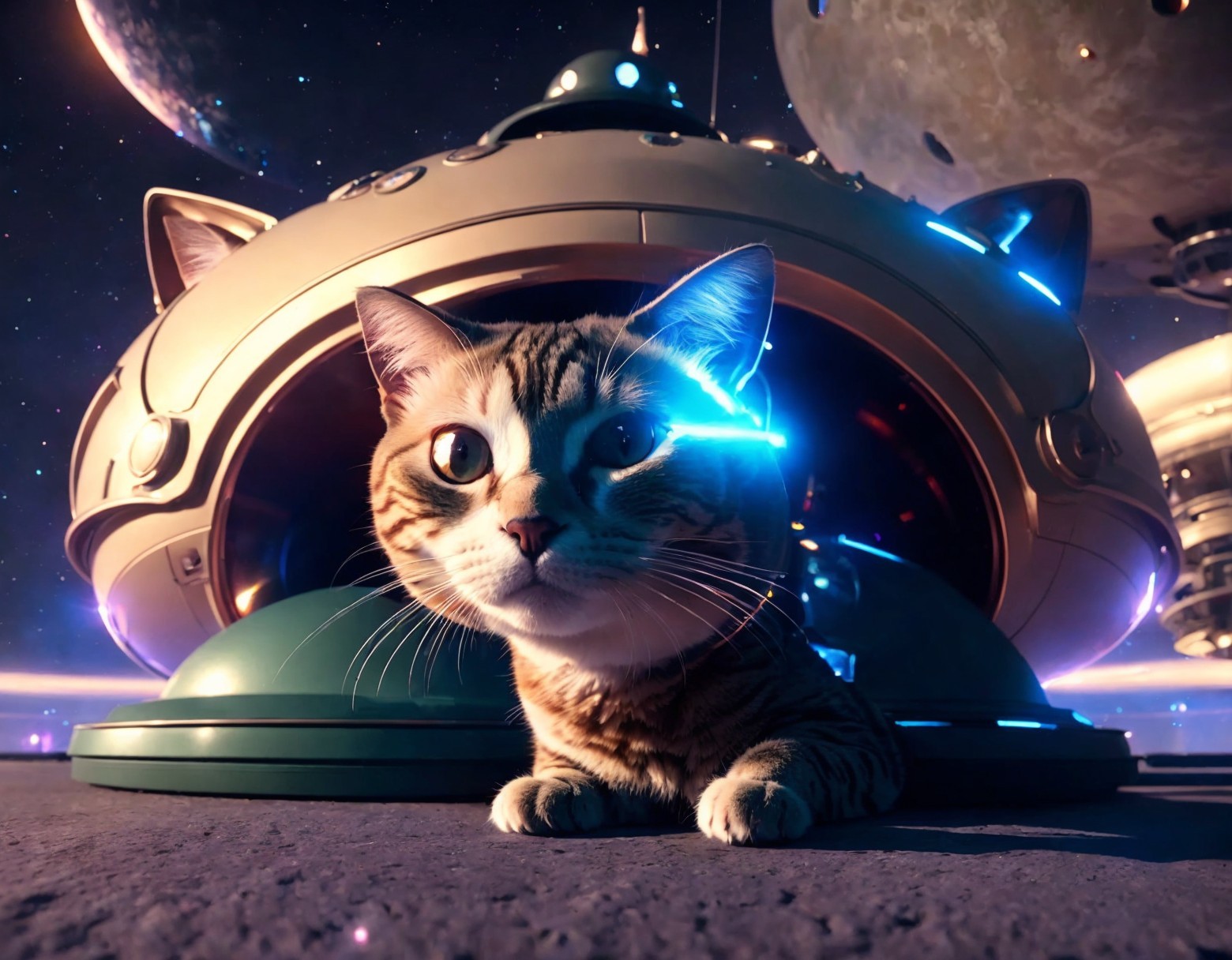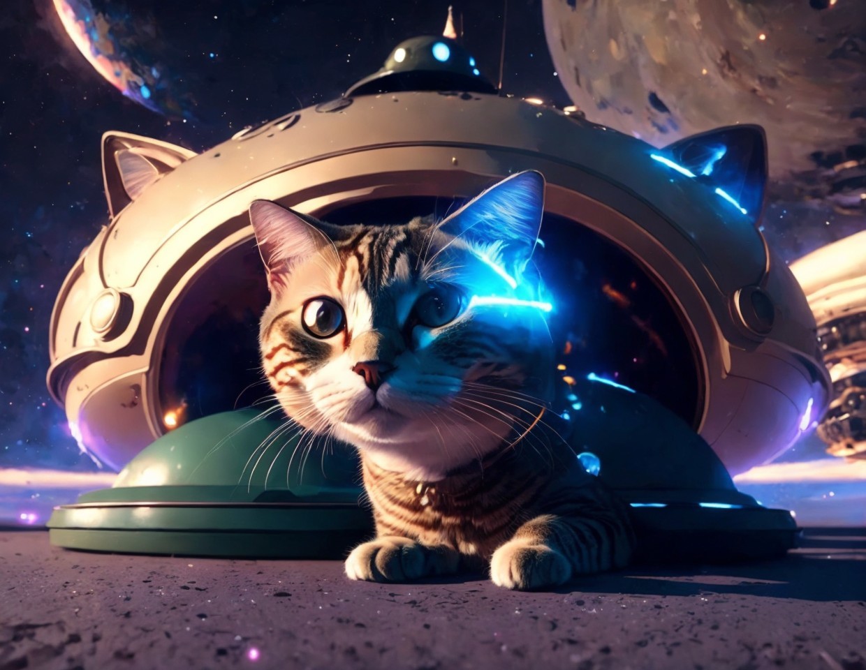 A futuristic tabby cat rests in front of a sleek, cat-shaped spacecraft, set against a backdrop of vibrant planets and stars, capturing a whimsical blend of space and feline charm.