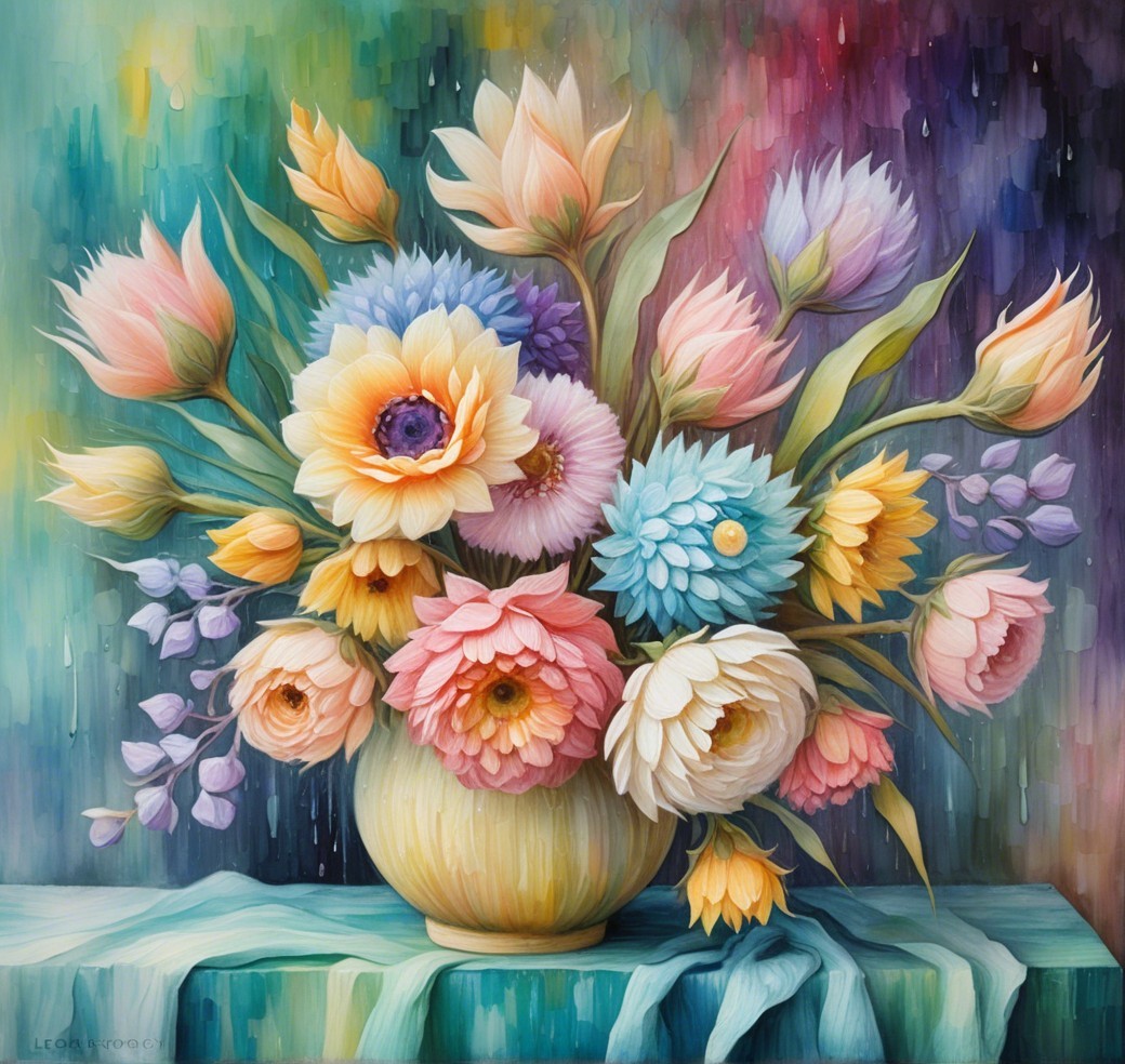 A vibrant arrangement of paper flowers in various colors, showcasing intricate layers and textures. It features blooms in blues, yellows, and soft pinks against a dark background.
