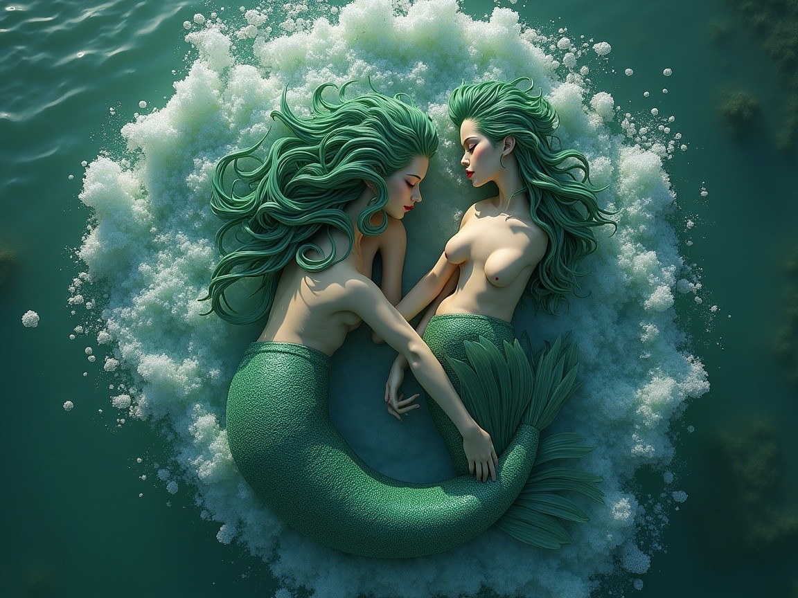 Two enchanting mermaids with flowing green hair entwined in a spiral, their shimmering tails creating splashes in the turquoise water, surrounded by a mystical, swirling foam.