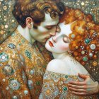 A romantic couple embraces, adorned in intricate, jewel-studded garments. Their tender pose and enchanting expressions are set against a shimmering, golden backdrop, evoking a sense of timeless love...