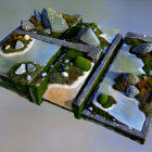Prompt: Landscape in shades of green, red, yellow, purple, grey, blue, black and white, with vegetal mosses, lichens, sand, granite rocks and limestone. extreme details