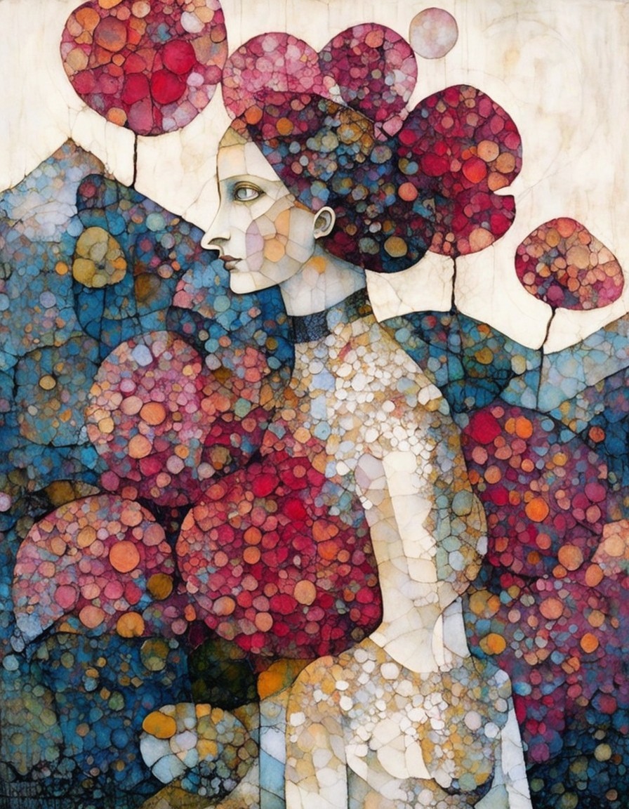 Stylized painting of a woman in a geometric, colorful outfit with abstract patterns and shapes surrounding her, evoking a modernist vibe.