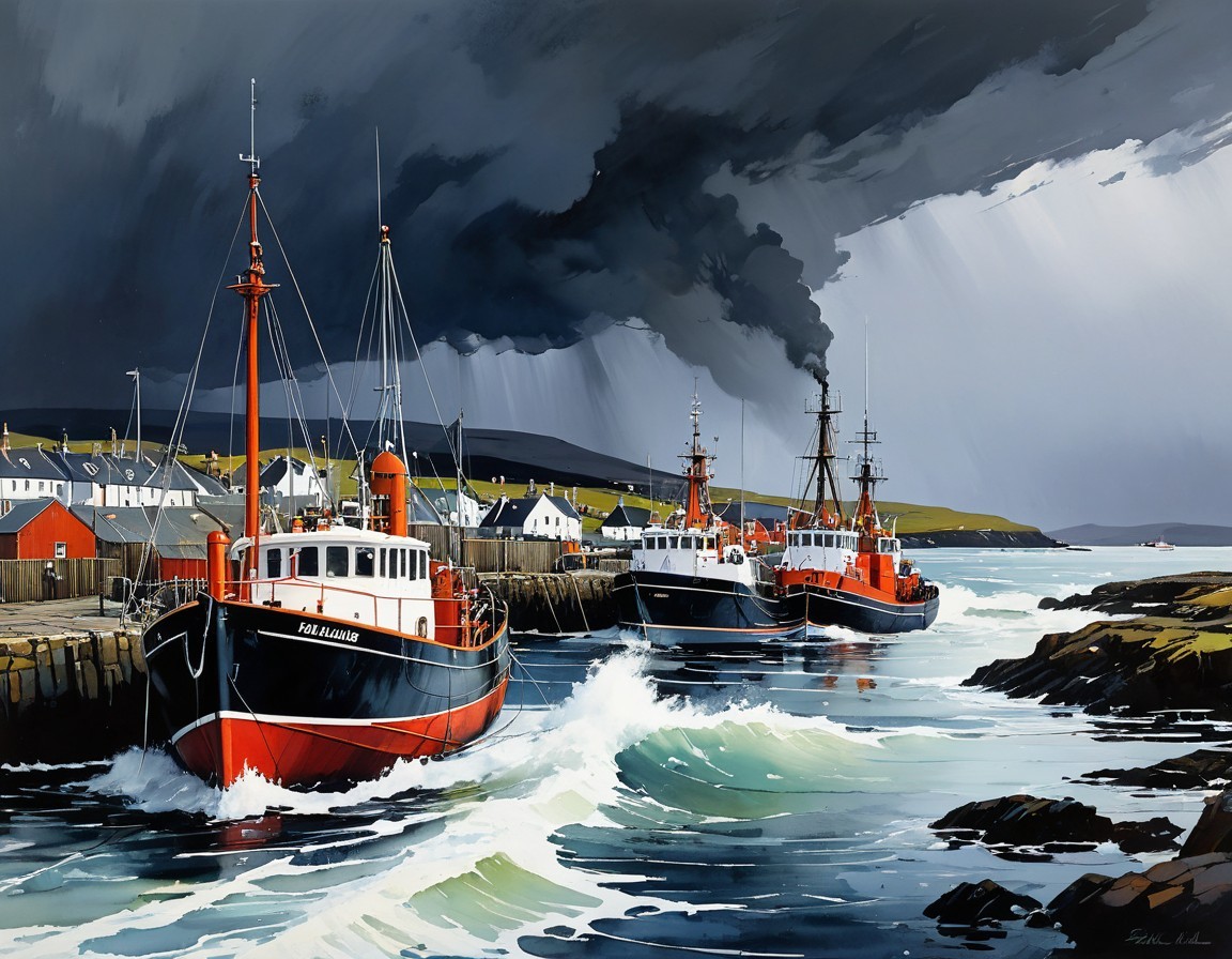 Dramatic Coastal Scene of Village by Rugged Shoreline