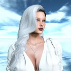 A stunning portrait of a woman with long, flowing silver hair, wearing a white shirt. She stands against a serene ocean backdrop under a bright, cloudy sky, exuding elegance and tranquility.