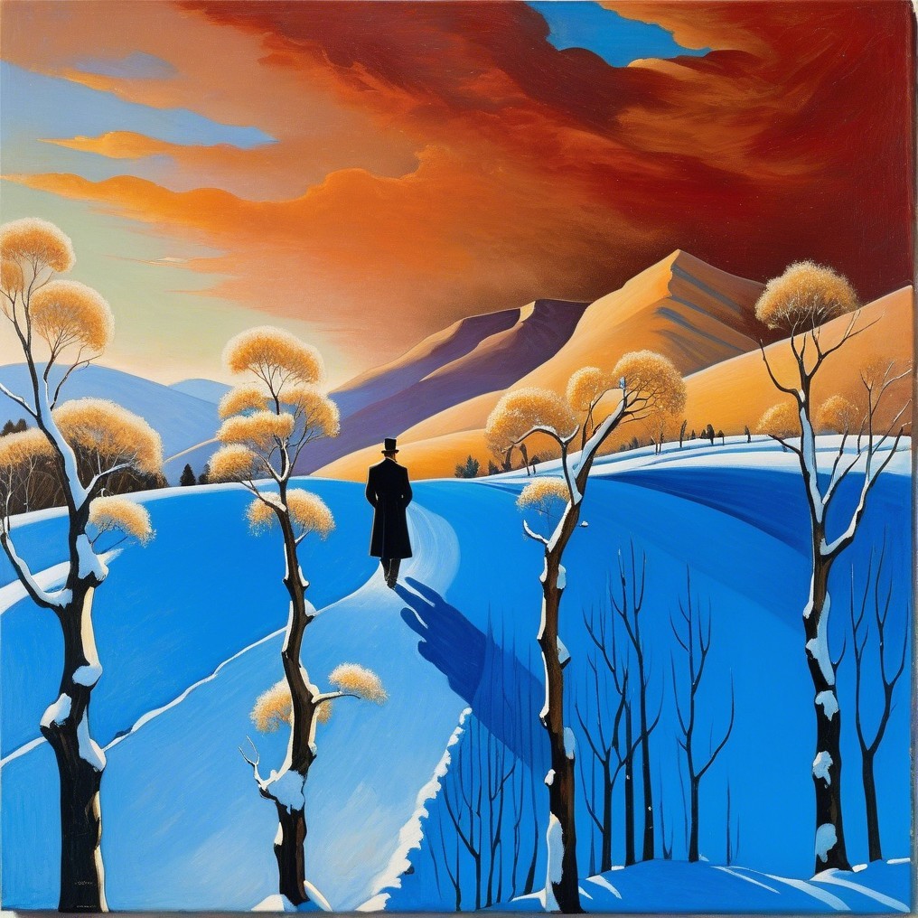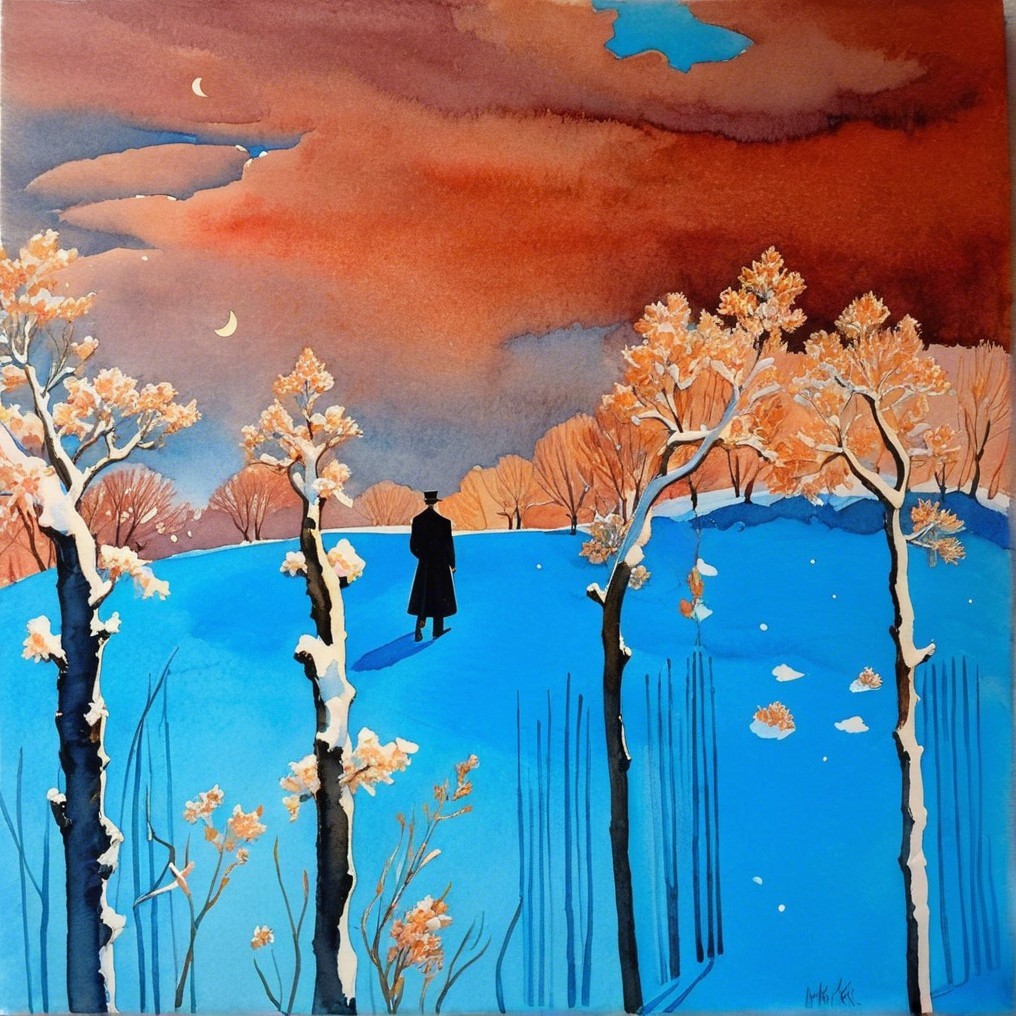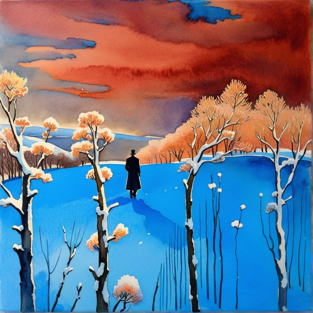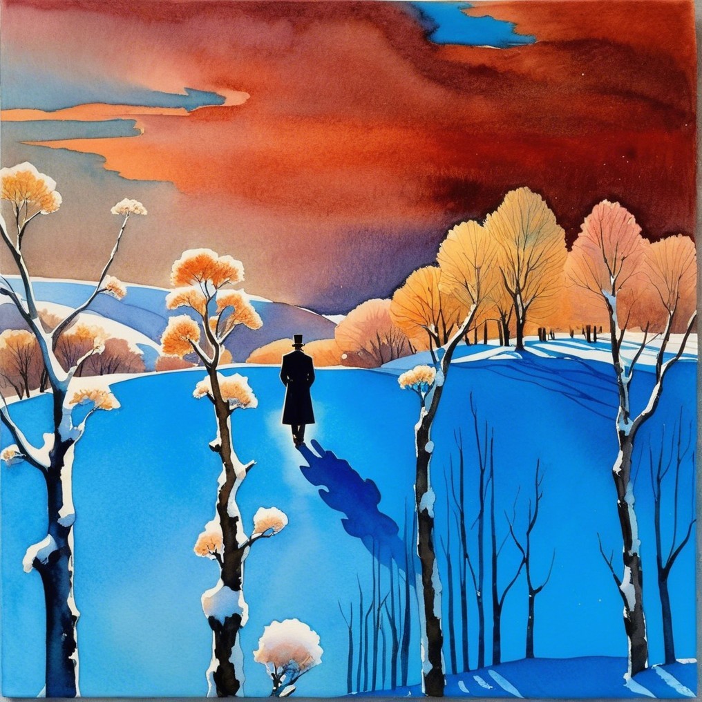Create an illustration featuring a tranquil landscape in a stylized art style. The foreground should showcase a solitary figure of a man standing on a snow-covered pathway. He has a light skin tone and a well-groomed beard, wearing a long black coat with a blue collar. The man is also adorned with a round black hat, and he gazes thoughtfully into the distance.