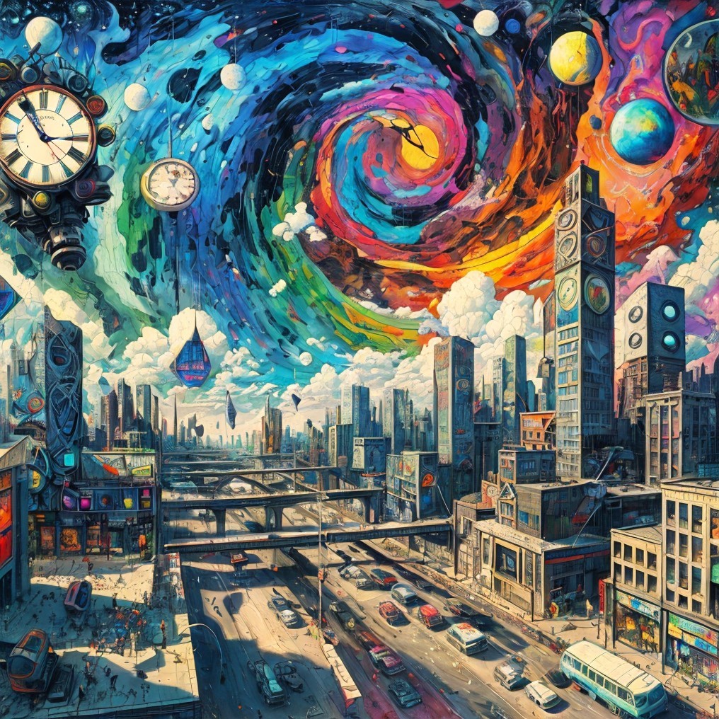 + Prompt:Modern city, lava river. clocks in sky, Black hole in the sky, psychedelic cloud colors, Comics style mixed with dystopian miniature work. Mixed media By Beksinski and Bill Sienkiewicz.