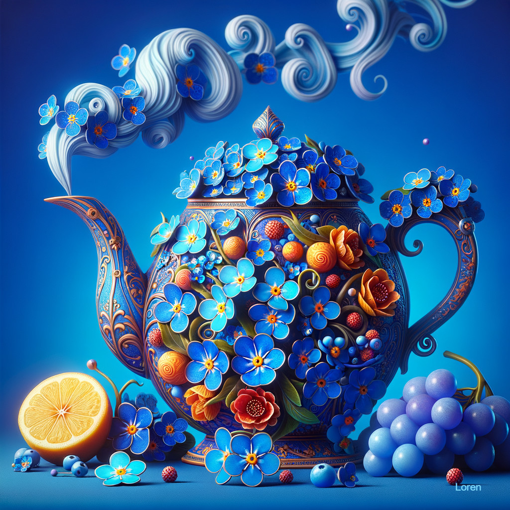 An ornate teapot with intricate patterns sits beside a lemon slice and grapes, all adorned with swirling, stylized clouds above.