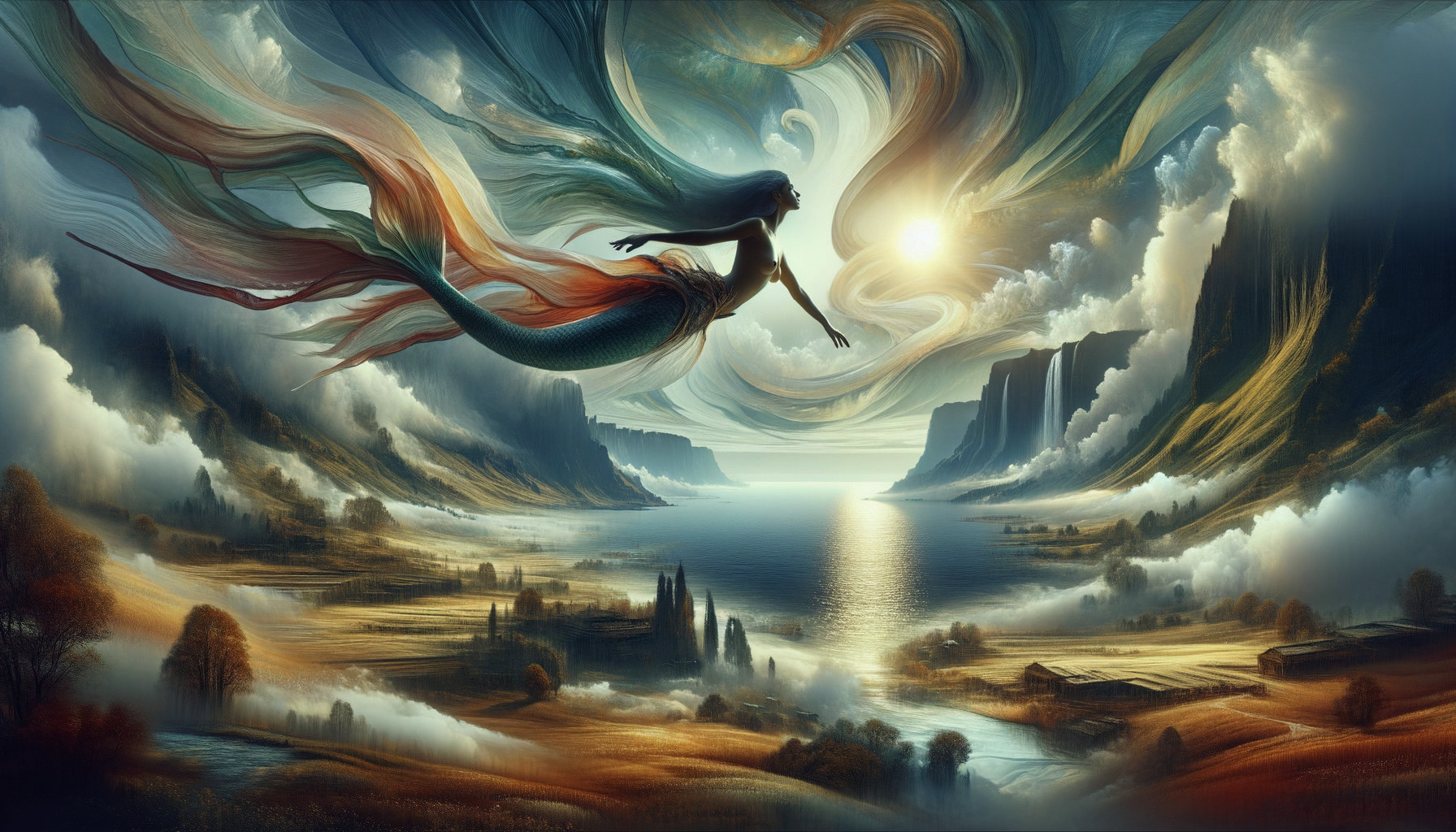 Flying mermaid controlling the valley; sea, hills