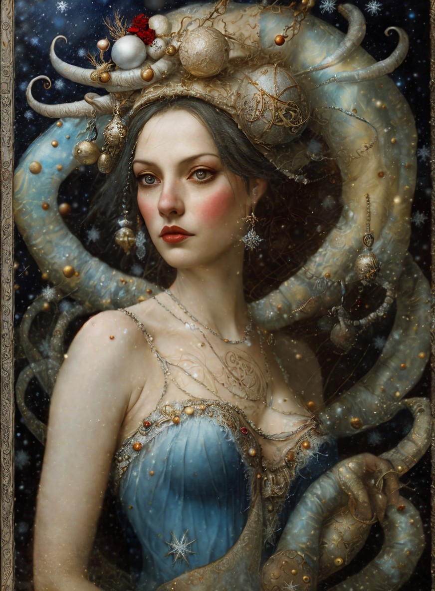 Winter-themed illustration of a pale-skinned woman with red cheeks and snowflake, berry, and golden