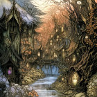 A whimsical winter scene features crooked, snow-covered houses lining a tranquil canal. Dim light spills from windows, with a bridge connecting to a distant castle shrouded in mist.